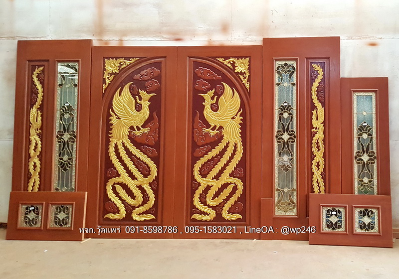 ประตูหน้าบ้านไม้สัก บานเลื่อน 7ชิ้น BB104 เเกะสลักลายหงส์คู่ ราคา 30,500 บาท ทำสี 37,500 บาท