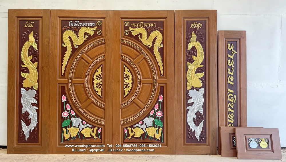 ประตูหน้าบ้านไม้สัก บานเลื่อน 4 ชิ้น BB234 เเกะสลักหงส์มังกร ราคา 25,500 บาท ทำสี 31,500 บาท